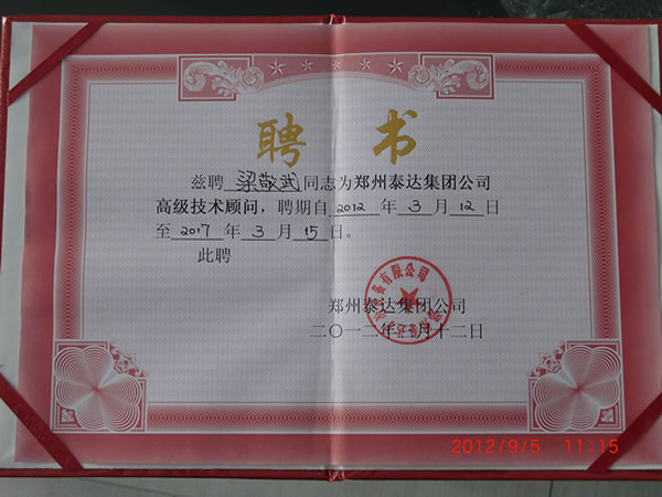 特聘河南省黃金局教授級高級工程師梁敬武先生為我鄭州泰達集團公司高級技術(shù)顧問。